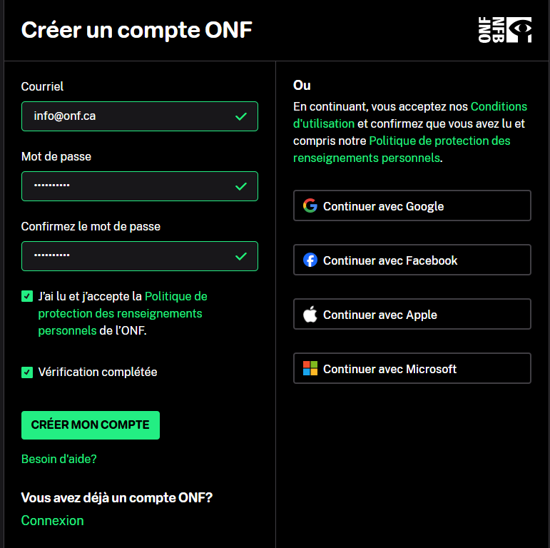 Pour créer un compte ONF.ca, cliquez sur la boîte « Créez votre compte ONF » en bas de la page connexion, ou rendez-vous à l’adresse suivante :